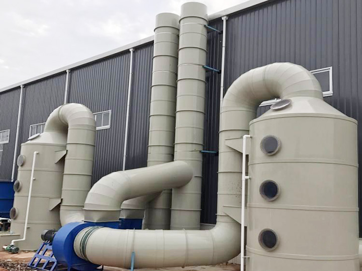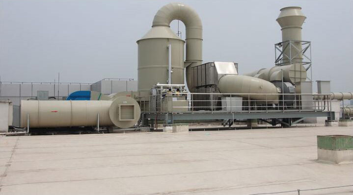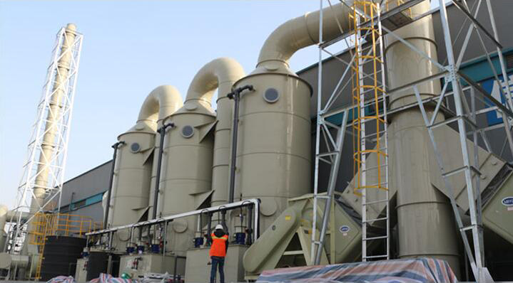 系統之風機組將收集到的廢氣吸入洗滌塔內,流經填充層段(氣/液接觸反應之介質),讓廢氣與填充物表面流動的藥液(洗滌液)充分接觸,以吸附廢氣中所含的酸性或堿性污物。