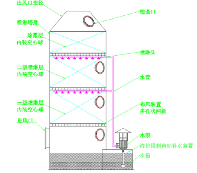 常規噴淋塔結構概括為:一層除霧、兩層噴淋、三層填料、四個視窗、五個活接球閥。